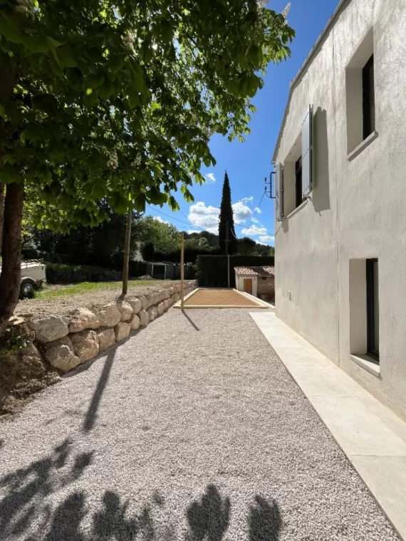 Votre entreprise de terrassement à Aix en Provence a réalisé une allée pour relier l'entrée de la maison au portail. Votre professionnel a également créé un terrain de pétanque à proximité de la maison.